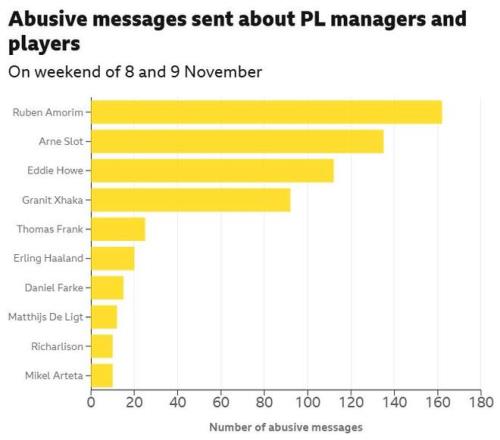 教练比球员更容易成为攻击目标,英超联赛中,阿莫林、斯洛特和埃迪-豪是最常被攻击的教练,而在英女超联赛中,切尔西女足及其教练邦帕斯托遭受了50%的攻击。
