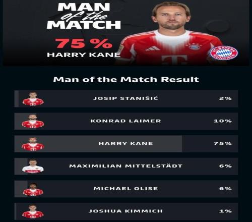最终经过德甲官网球迷投票,凯恩以75%的得票率当选全场最佳球员。