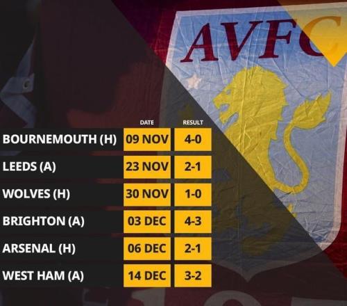维拉最近6场英超比赛全部取得胜利,先后击败伯恩茅斯(4-0)、利兹联(2-1)、狼队(1-0)、布莱顿(4-3)、阿森纳(2-1)和西汉姆联(3-2)。
