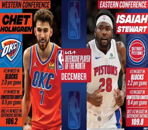 雷霆队球员连续第二个月斩获西部月最佳防守球员奖项。继后卫卡森-华莱士当选10/11月西部最佳防守球员后,内线球员霍姆格伦凭借12月的出色表现,成功将该荣誉收入囊中。
